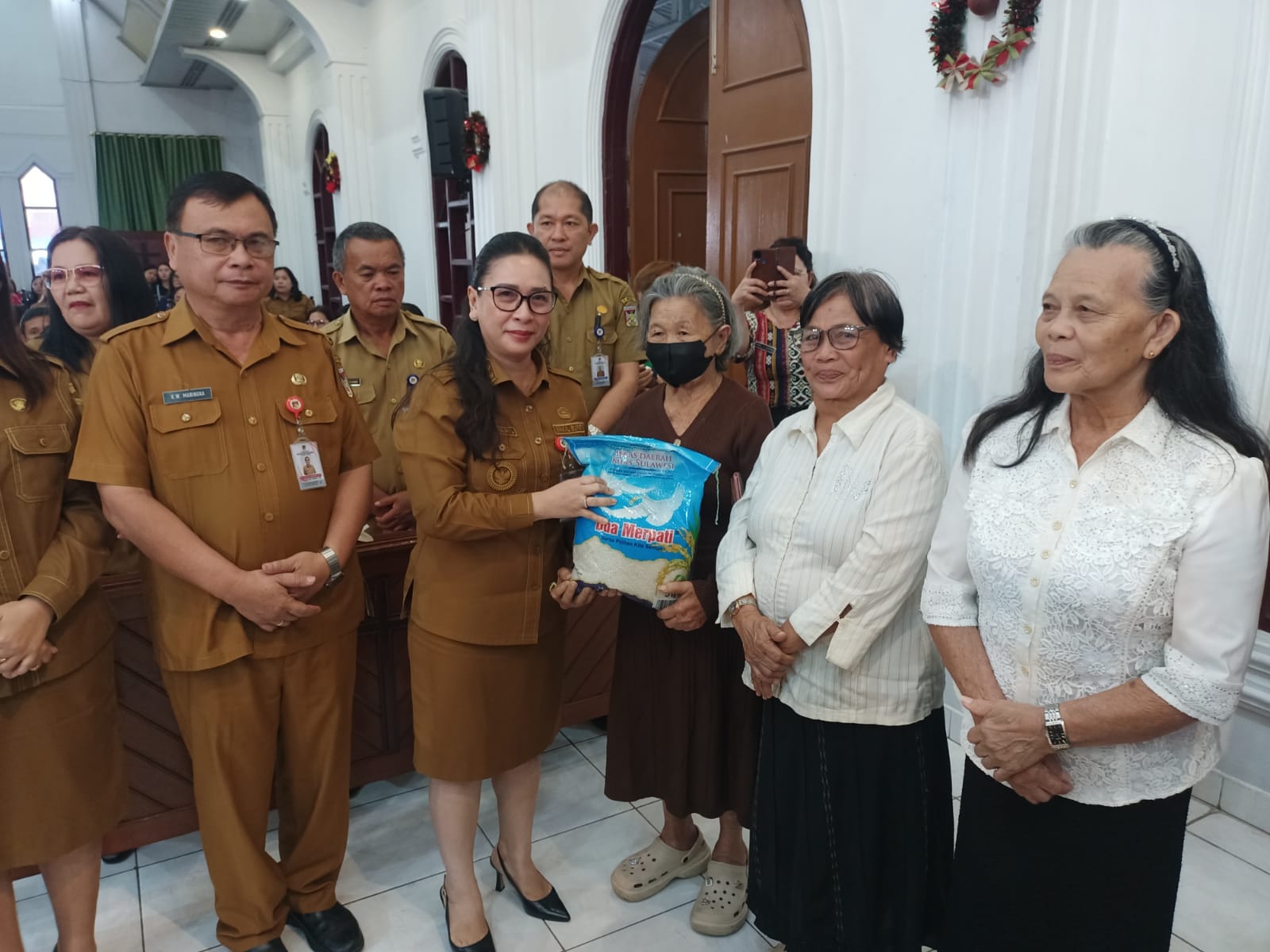 Diakhir ibadah, dilakukan penyerahan bantuan dan Diakonia Natal bagi warga kurang mampu dan stunting. (Welly Mamonto)